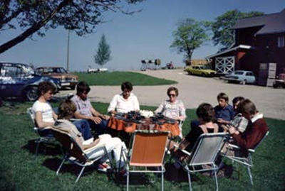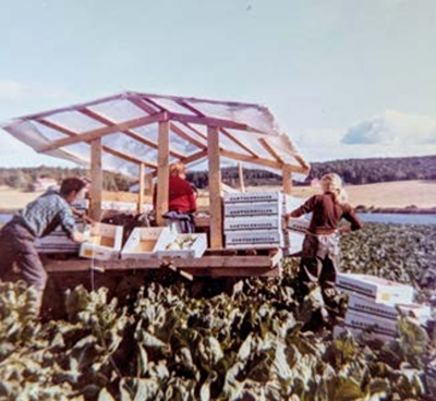Produksjon av grønnsaker skapte behov for sesonghjelp. Slik ble det vanlig med praktikanter som kom hit for å jobbe i noen måneder mellom mai og november. Trolig kom det mellom 20 og 30 utenlandske. praktikanter i året til daværende Ski kommune. Først kom de fleste fra land i Europa, som Tyskland, Sveits, Island, Nederland, Østerrike og Frankrike. Noen kom også fra U SA og senere fra Litauen, Tsjekkia, Polen og Japan. Vi som skriver dette, var praktikanter i tiden fra mellom 1966 og 1976. Bildet viser en doning som man bygde rundt en traktor som ble brukt under innhøsting. En person kjørte traktoren sakte framover i radene mens andre skar blomkålen og la den pent opp i kassene. Foto forfatterne.